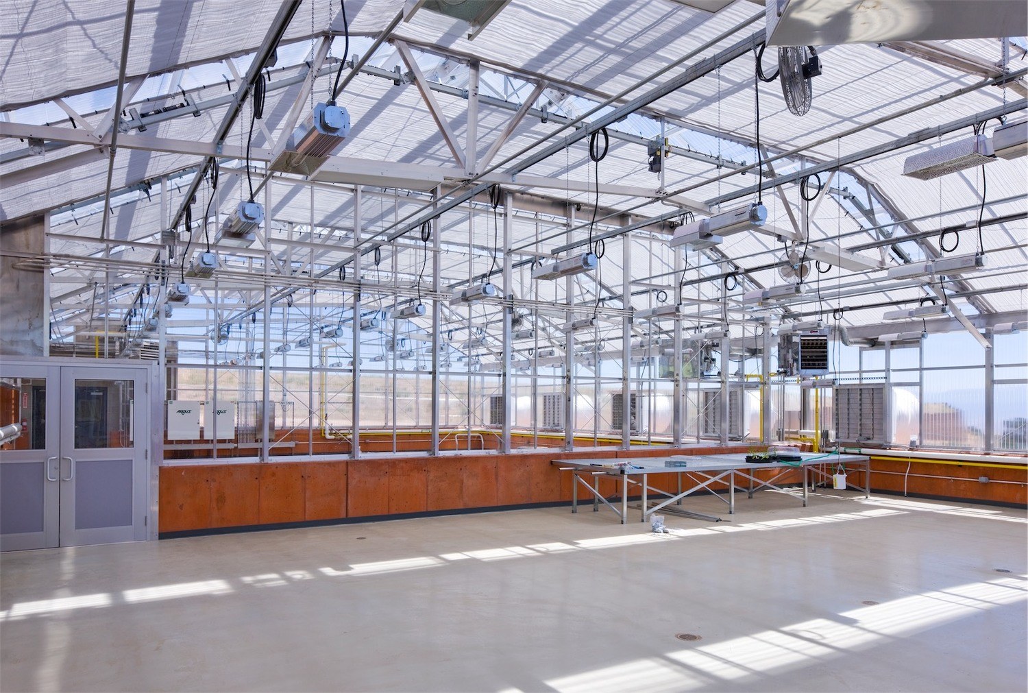 Within the laboratory and office facility, there is a main laboratory housing fifty employees. There are eight individual labs contained in the structure where access can be restricted as required for experiments and two rooms with a BSL2 rating for biochemical research. The lab also includes three open office spaces containing cubicles for work areas. The greenhouse is fully automated with a sophisticated computer system to control temperatures and humidity so plants can be studied in specialized environments.