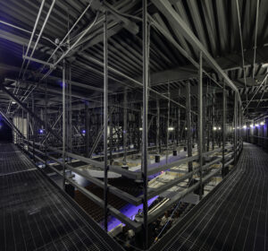 Far above the stage, a view of the catwalk.