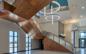 Architecturally, the building reflects both modern design and regional identity. Exterior materials complement the surrounding desert landscape, while interior finishes, many completed by Jaynes’ self-perform teams, demonstrate craftsmanship in elements such as acoustic paneling and architectural millwork.