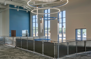 Second floor lobby and unique stairwell lighting.