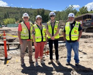 Pictured: The Dolores Schools team on the project site with Jaynes managers. From left to right: Mark Trujillo, Jaynes Senior Superintendent, Alessa Reed, Dolores Schools Superintendent, Matt Prinster, Artaic Owners Representative, and Alfonso Goad, Dolores Schools Maintenance Director.